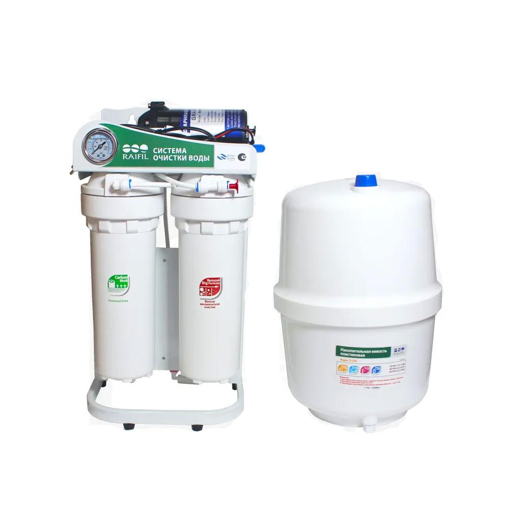 Raifil RO50-G — это четырёхступенчатая система обратного осмоса со встроенным насосом повышения давления, предназначенная для глубокой очистки питьевой воды в квартире или частном доме. Устанавливается под мойку, вода подаётся через отдельный кран на столешнице.