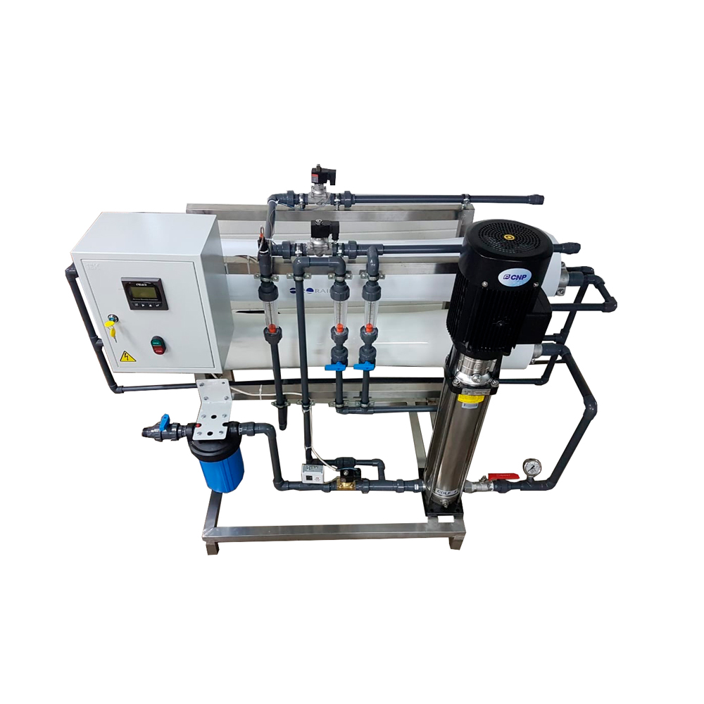 Вода поступает в установку обратного осмоса «RE-2000», размещѐнную на раме, по трубопроводам в насос, который подает воду под высоким давлением в блок мембран. Здесь происходит разделение воды: молекулы чистой воды (фильтрат) продавливаются через мембрану и выводятся из системы очистки в накопительный резервуар чистой воды, а концентрированный солевой раствор (концентрат) сбрасывается в канализацию. Управление и контроль за работой установки осуществляется микропроцессорным контроллером, расположенном в шкафу управления, на который приходит информация о качестве воды и работе установки. По желанию Заказчика шкаф управления может оснащаться дополнительными функциями измерения, сигнализации и управления.