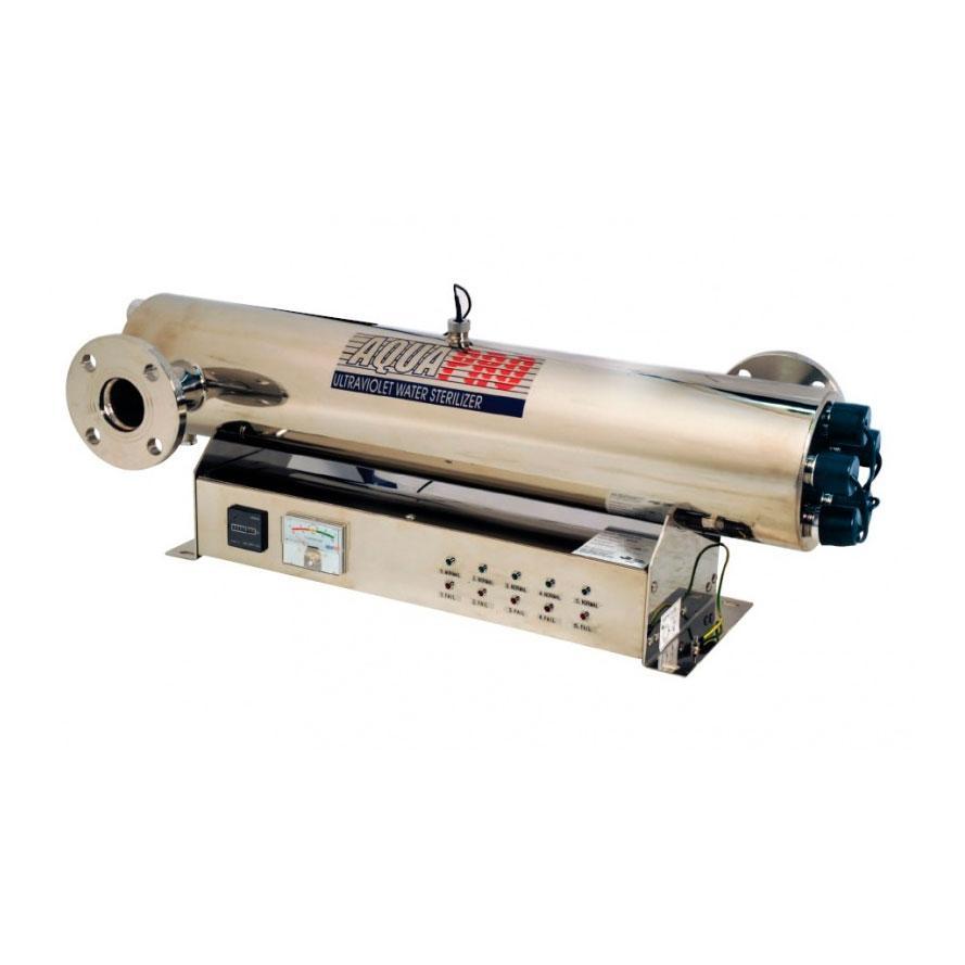 Корпус УФ установки AquaPro UV72GPM выполнен из пищевой нержавеющей стали марки SS304. Внутри корпуса находится пять одинаковых ультрафиолетовых ламп мощностью 39 W, отвечающих за удаление из воды различных микроорганизмов, микробов, бактерий. Так же ультрафиолетовая стерилизация имеет преимущество перед другими способами обеззараживания воды — это отсутствие воздействующих на воду химических веществ (хлор).