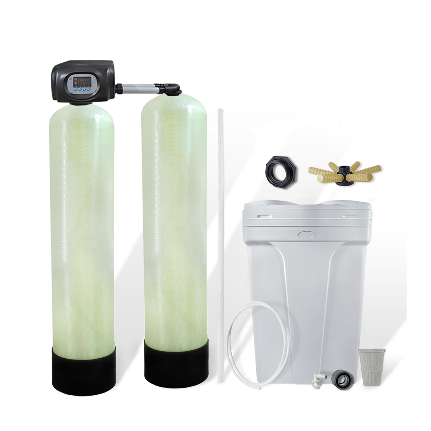 DUPLEX — состоит из двух корпусов, соединенных параллельно. В этой схеме постоянно фильтрует только одна часть установки. Вторая часть либо находится в регенерации, либо в режиме ожидания. Когда фильтрующий корпус истощается, то вторая вступает в работу. Эта система обеспечивает непрерывность умягчения воды с заданной производительностью.
