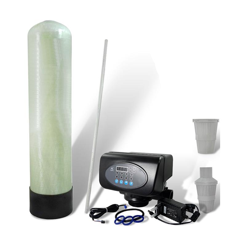Клапан автоматического управления применяется в системах обезжелезивания воды. Имеет стойкость к истиранию, меньшую подверженность коррозии. Клапан управления Runxin TMF67 (P1) дополнительно требует стеклопластиковую колонну с верхним резьбовым выходом 2 1/2″, а также какой-либо фильтрующий наполнитель (МЖФ, активированный уголь и др.). После сбора системы клапан подключается к трубам исходной и очищенный воды, а также к дренажному сливу для процесса промывки наполнителя.