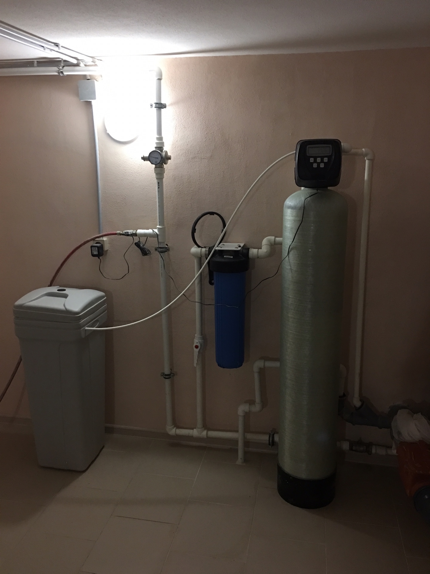 2) Фильтр с ионообменной смолой 1044/F63P3 с автоматической регенерацией по расходу воды. Регенерация – промывка обратным потоком воды с дозированием солевого раствора.